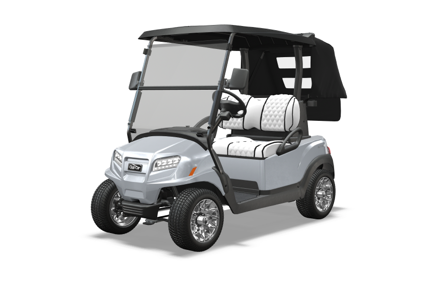 2026 Club Car Onward 2-Pass Gas Golf Cart. This unit comes with dual USB ports, wireless center storage chargers, full light package, horn, elite double diamond stitched seats, ball & club washer, cooler, premium tinted windshield, side mirrors, premium club protector and 12″ Chrome Athena wheels with Kruizer tires.
